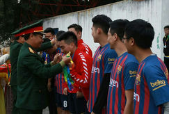 Lãnh đạo, chỉ huy Tổng công ty GAET trao huy chương Vàng cho các cầu thủ đội bóng đá Liên quân 1 giành chức vô địch môn bóng đá mini nam.