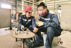 Đồng chí Nguyễn Cảnh Nam (đội mũ) trao đổi phương án gia công chi tiết cơ khí phục vụ đóng tàu.  Ảnh: VĂN PHƯỢNG