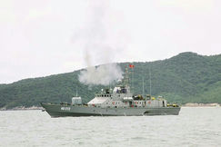 Chiếc tàu pháo TT400TP đầu tiên do Nhà máy Z173 đóng mới trong buổi nghiệm thu bắn đạn thật.  Ảnh: LÊ NAM