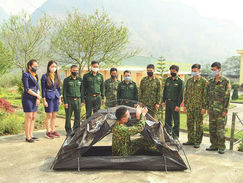 Bộ đội Biên phòng tỉnh Lào Cai và đại diện nhà tài trợ chứng kiến thực hành sử dụng lều quân dụng cá nhân.   Ảnh: TRỌNG HẢI