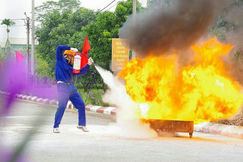 Thao tác sử dụng bình cứu hỏa cá nhân dập đám cháy.