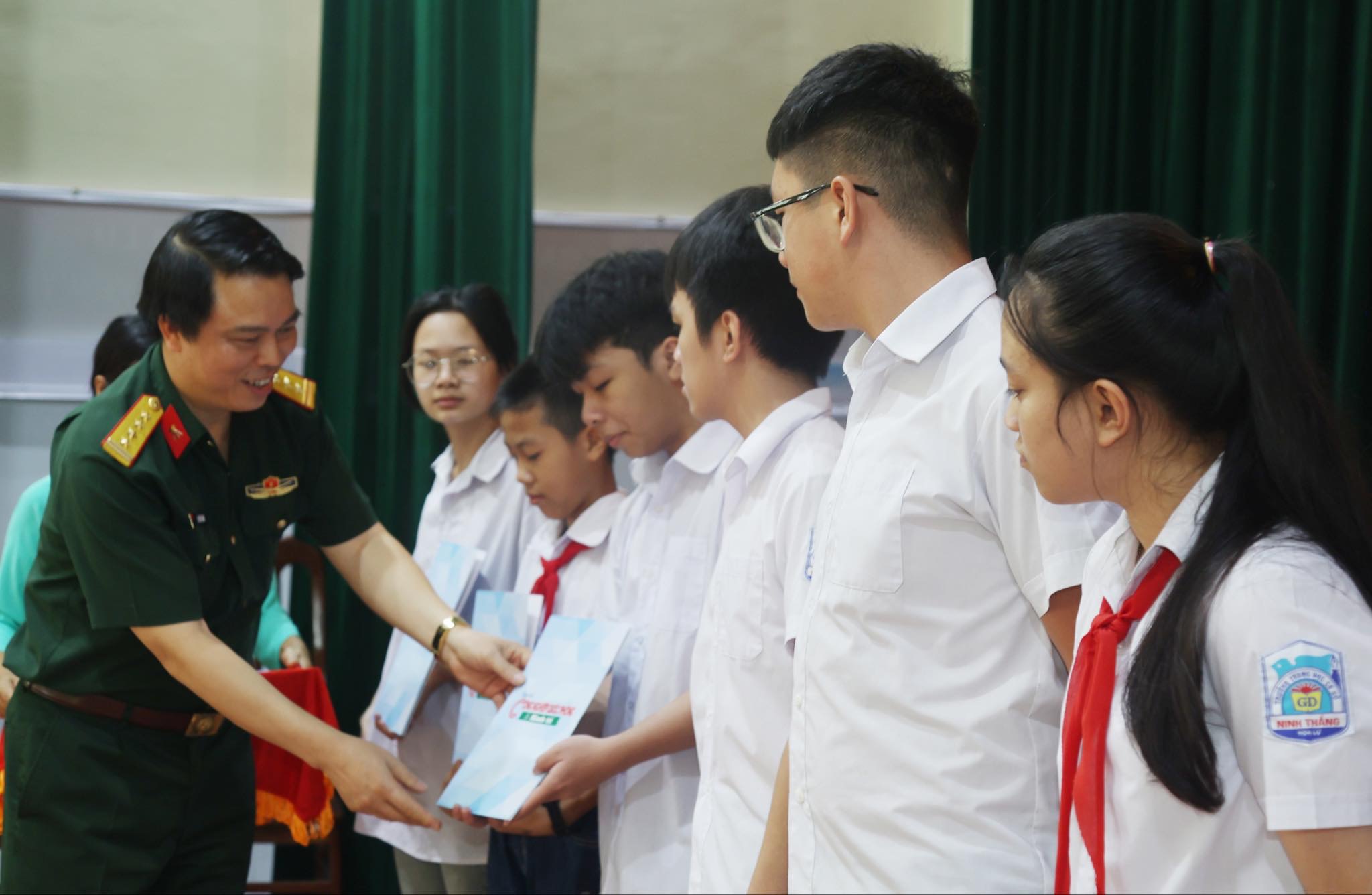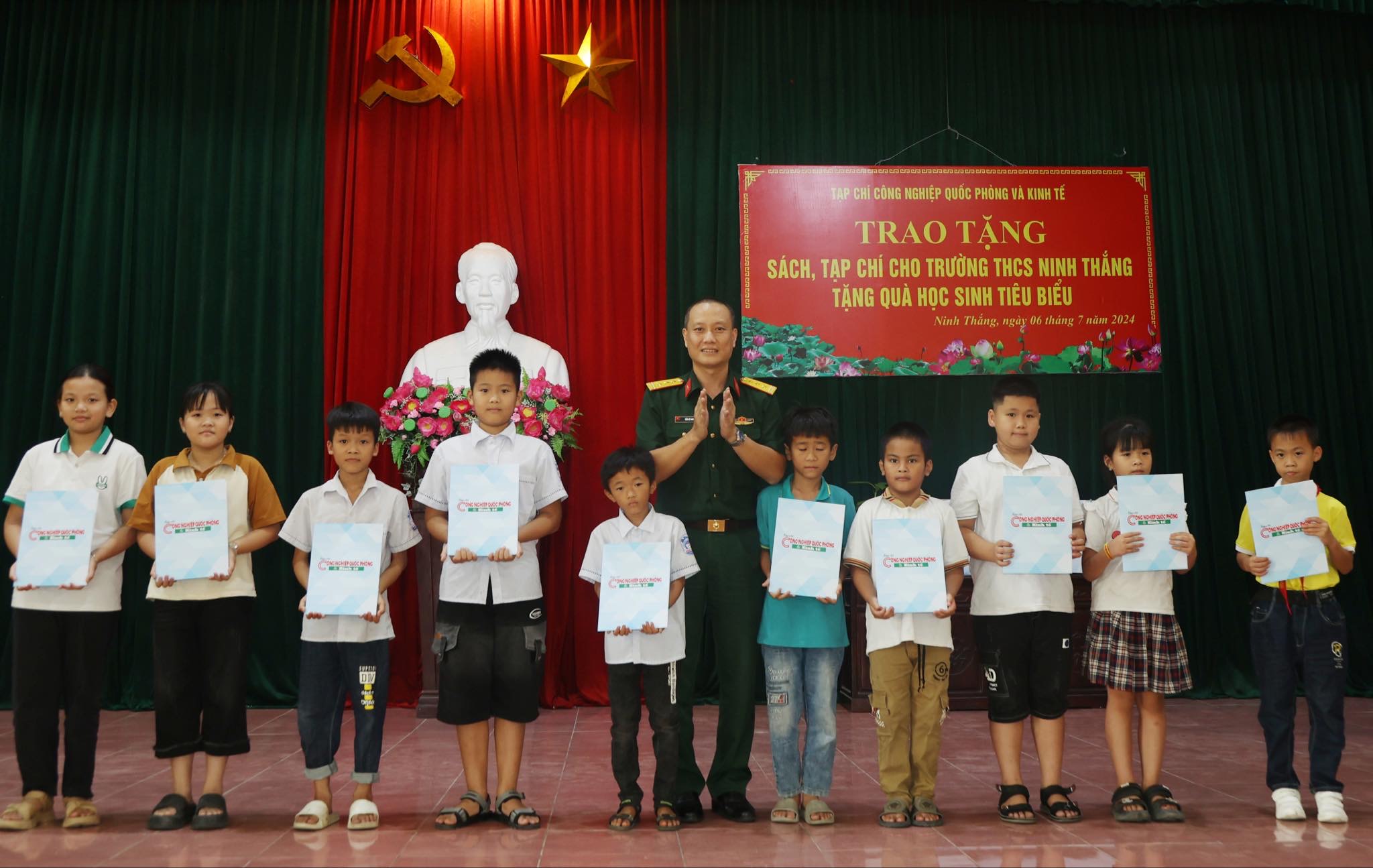 Đại tá, Nhà báo Lê Thiết Hùng-Tổng biên tập Tạp chí Công nghiệp quốc phòng và Kinh tế, tặng quà học sinh tiêu biểu và học sinh có hoàn cảnh khó khăn của Trường THCS Ninh Thắng.