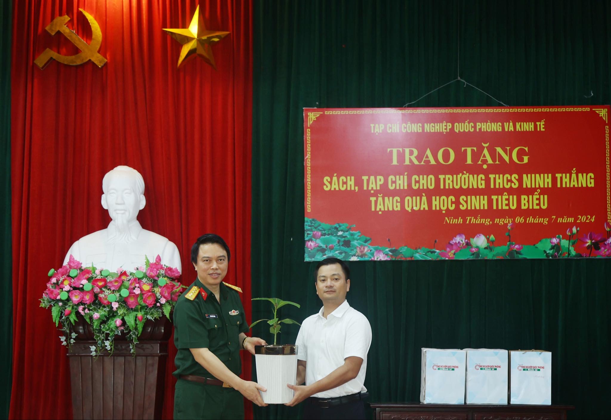 Đại tá, Nhà báo Lê Thiết Hùng-Tổng biên tập Tạp chí Công nghiệp quốc phòng và Kinh tế, trao quà phục vụ công tác khuyến học, khuyến tài trường THCS Ninh Thắng.