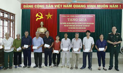 Thiếu tướng Lê Ngọc Thân, Chủ nhiệm Chính trị Tổng cục CNQP, trao quà tặng các đối tượng chính sách và hộ nghèo của thị trấn Đồng Tâm (Bắc Kạn).
