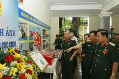 Các đại biểu xem khu trưng bày các tác phẩm đạt giải cao trong Cuộc thi tìm hiểu cuộc đời, thân thế, sự nghiệp của Thiếu tướng, Giáo sư, Viện sĩ, Anh hùng Lao động Trần Đại Nghĩa.
