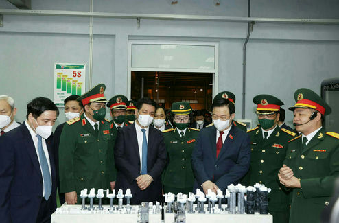 Chủ tịch Quốc hội Vương Đình Huệ và các đại biểu xem chi tiết sản phẩm quốc do Nhà máy Z111 nghiên cứu chế tạo.