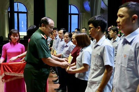 Thiếu tướng Nguyễn Việt Hùng, Phó Chính ủy Tổng cục CNQP trao quà của Tổng cục tặng người lao động có hoàn cảnh khó khăn của Nhà máy Z121.