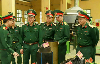 Thượng tướng Bế Xuân Trường và đoàn công tác của Bộ Quốc phòng thị sát một phân xưởng sản xuất.