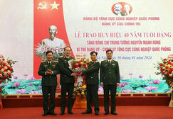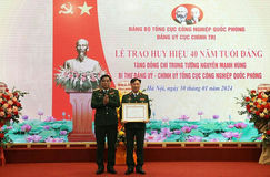Trung tướng Hồ Quang Tuấn, Phó Bí thư Đảng ủy, Chủ nhiệm Tổng cục CNQP trao Huy hiệu 40 năm tuổi Đảng tặng Trung tướng Nguyễn Mạnh Hùng.