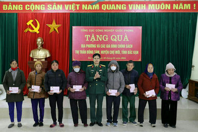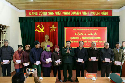 Đại tá Nguyễn Đức Tăng, Phó Chính ủy Tổng cục CNQP trao quà tặng các gia đình chính sách xã Đồng Thịnh (huyện Định Hóa, tỉnh Thái Nguyên).
