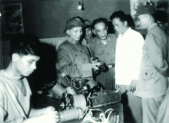 Thiếu tướng Lê Văn Chiểu (thứ 3 từ phải sang) tháp tùng đồng chí Lê Duẩn, Bí thư thứ nhất Ban Chấp hành Trung ương Đảng Lao động Việt Nam, thăm Nhà máy V119 (nay là Nhà máy Z119) trong kháng chiến chống Mỹ.     Ảnh: TL