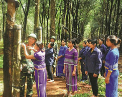 Cán bộ Binh đoàn 15 hướng dẫn người dân địa phương kỹ thuật khai thác mủ cao su.   Ảnh: CTV