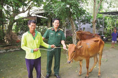 Do hoàn cảnh khó khăn nên năm 2018, anh Mai Văn Phát, ấp Rạch Dứa, xã Phú Mỹ, huyện Giang Thành, tỉnh Kiên Giang được Đoàn KT-QP 915 hỗ trợ 2 con bò giống lai Sind. Nhờ được chăm sóc tốt, 2 con bò giống sinh được 6 con bê, anh Phát bán được hơn 100 triệu đồng và hoàn trả 2 con. "Khi nhận bò, tôi vừa mừng vừa lo bởi chưa có kinh nghiệm chăn nuôi, sợ bò phát triển không tốt, nhưng được bộ đội Đoàn KT-QP 915 hướng dẫn kỹ thuật chăm sóc nên bò phát triển tốt, sinh sản nhanh. Nhờ số tiền bán bò, kinh tế gia đình tôi đã được cải thiện" - Anh Phát tâm sự.