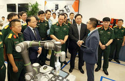 Thứ trưởng Bộ Quốc phòng Vũ Hải Sản và Thứ trưởng Bộ Kế hoạch và Đầu tư Trần Duy Đông cùng các đại biểu tham quan không gian đổi mới sáng tạo.