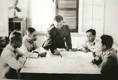 Đại tá Lê Nam Thắng - Cục trưởng Cục Nông trường Quân đội và các cán bộ Cục bàn kế hoạch xây dựng các nông trường.  Ảnh: TL