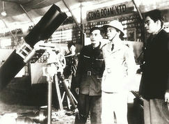 Cục phó Cục Quân giới Nguyễn Duy Thái (thứ 3 từ phải sang), tháp tùng Đại tướng Võ Nguyễn Giáp kiểm tra vũ khí do Quân giới chế tạo (năm1950).  Ảnh: TL