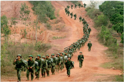 Bộ đội hành quân diễn tập trên thao trường.    Ảnh: CTV