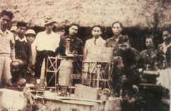 Kỹ sư Võ Quý Huân (thứ tư từ phải sang) giới thiệu công trình chuẩn bị dự triển lãm năm 1949, gồm: Tượng Chủ tịch Hồ Chí Minh, mô hình lò cao thí nghiệm 3KC, nồi hơi, máy phát điện.   Ảnh: TL