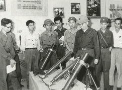 Đồng chí Trần Đại Nghĩa cùng các cán bộ Quân giới xem sản phẩm do nhà máy Quân giới sản xuất thời chống Mỹ.  Ảnh: TL