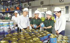 Thượng tá Nguyễn Đức Hiếu, Giám đốc Công ty Sơn Hải Âu cùng các cán bộ kỹ thuật kiểm tra sản phẩm sơn.